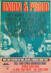 Scope and ContentPoster with an image of a group of workers and the text Union and proud. For a worker to refuse to be financial in the union is not to exercise a democratic freedom. It is to accept benefits that others have worked for without contributing to the costs. Make sure everyone on your job has a financial union ticket. Call your CFEMU organiser now!