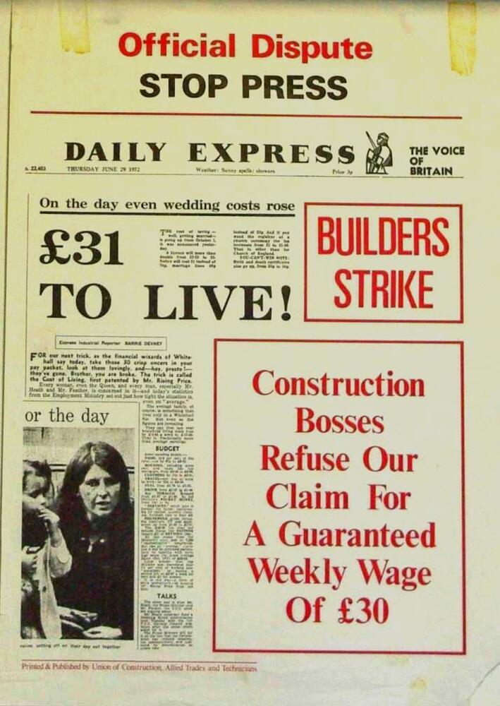 Scope and ContentPoster with an image of the front page of the Daily Express for 29 Jun 1972 and the text: Official dispute. Stop press. Builders strike. Construction bosses refuse our claim for a guaranteed weekly wage of £30.