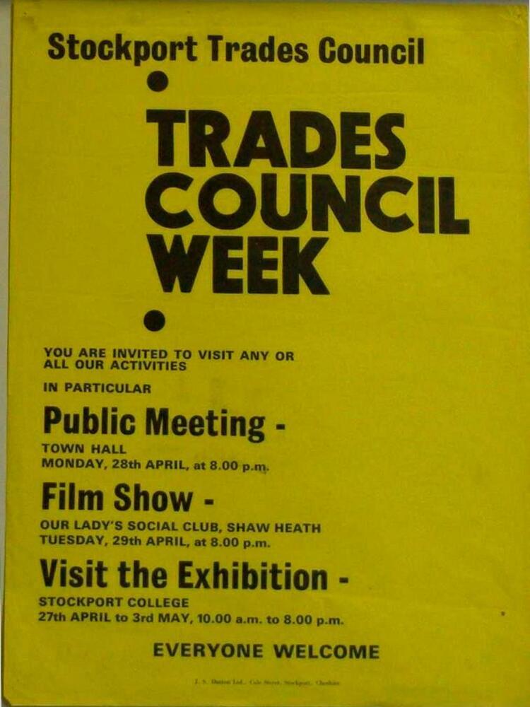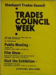 Scope and ContentPoster with the text: Stockport Trades Council. Trades Council week. You are invited to visit any or all of our activities, in particular: Public meeting, Town Hall, Monday 28th April at 8.00pm; Film show, Our Lady's Social Club, Shaw Heath, Tuesday 29th April at 8.00pm; Visit the exhibition, Stockport College, 27th April to 3rd May 10.00am to 8.00pm. Everyone welcome