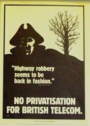 Scope and ContentPoster with an image of a highwayman and the text: "Highway robbery seems to be back in fashion." (Dick Tory 1982). No Privatisation of BT