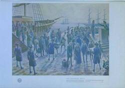 Scope and ContentPoster with an image of a watercolour by John Gelsavage and the text: The Colonial Days. Indentured servants came to America by the thousands in colonial days and worked out the price of their passage as 'bound servants' to the highest bidder. Few of them found the 'streets of gold' which had been promised them; instead most found years of hardship and privation while working out their debt.