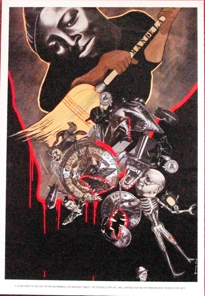 Scope and ContentPoster with an image entitled A clean sweep by Sue Coe for Nelson Mandela 70th birthday tribute. "The struggle is my life, I will continue fighting for freedom until the rest of my days"