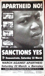 Scope and ContentPoster with a various images of apartheid and the text: Apartheid no! Sanctions yes. Demonstrate Saturday 22 March. March against Apartheid. Barnsley