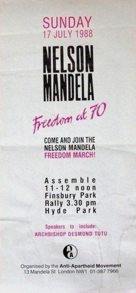 Scope and ContentPoster with the text: Sunday 17 July 1988. Nelson Mandela. Freedom at 70. Come and join the Nelson Mandela freedom march! Assemble 11-12 noon Finsbury Park. Rally 3.30pm Hyde Park. Speakers to include: Archbishop Desmond Tutu