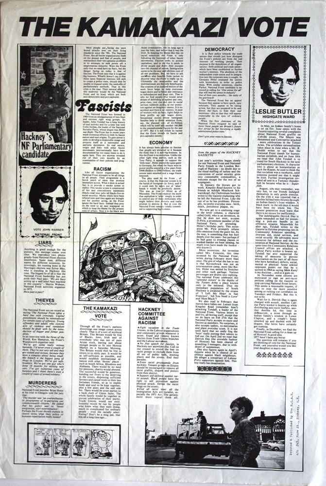 Scope and ContentPoster headed The kamikazi vote detailing the case against Hackney's National Front Parliamentary candidates. Printed and published by the Hackney Committee against Racialism (HCAR)
