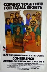Scope and ContentPoster with an image of a group of people and the text: Coming together for equal rights. Migrants, immigrants and refugees conference. Saturday 6 and Sunday 7 October 1984. Sir William Collins School, Charrington Street, London. Workshops (Unionisation, 'Unauthorised' working, Health, Youth, Women), Speakers, Interpreters, Signers, Creche, Free entrance and food. Limited disabled access.
