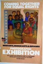 Scope and ContentPoster with an image of a group of people and the text: Coming together for equal rights. Migrants, immigrants and refugees photographic exhibition. GLC County Hall entrance lobby, 22-29 September. Sir William Collins School 6/7 October.