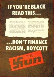 Scope and ContentPoster with the text: If you're black read this ... Don't finance racism, boycott The Sun [with an inserted article from The Tatler about Kelvin Mackenzie, editor of The Sun]