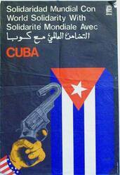 Scope and ContentPoster with the Cuban flag and a hand holding gun with its barrel bent back and the text: Solidaridad mundial con Cuba. World solidarity with Cuba. Solidarite mondiale avec Cuba.