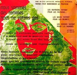 Scope and ContentPoster with an image of a woman and the text: Nous sommes des femmes. Nous ne votons pas. Nous ne donnons pas nos voix a ceux qui ont le pouvoir sur nous, a ceux qui nous font des lois, le loi. Nous ne sommes pas representables. Nous luttons ensemble en dehors de la loi pur renverser le pouvoir capitaliste, imperialiste et partriarcal, pour que les femmes et toutes les forces opprimees, toutes et tous, puissant agir, penser, parler, faire. Des femmes du mouvement de liberation des femmes.
