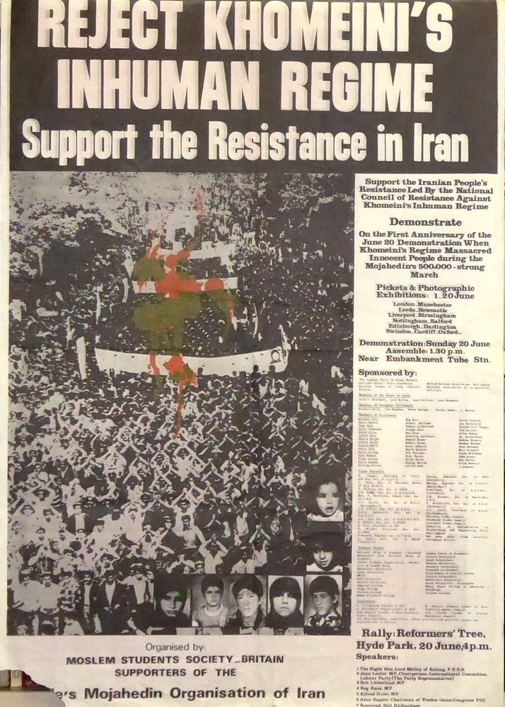 Scope and ContentPoster with an image of a demonstration and the text: Reject Khomeini's inhuman regime. Support the resistance in Iran. Support the Iranian people's resistance led by the national council of resistance against Khomeini's inhuman regime. Demonstrate on the first anniversary of the June 20 demonstration when Khomeini's regime massacred innocent people during the Mojahedin's 500,000 strong march. with details of pickets and a photographic exhibition, along with a list of sponsors of the demonstration