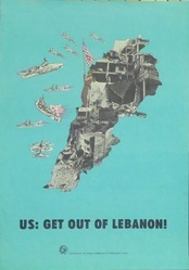 Scope and ContentPoster with a map of Lebanon with destroyed buildings superimosed on it and cartoon ships firing missiles and the text: US get out of Lebanon.