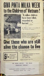 Scope and ContentPoster with an image of children walking along a trench and the text: Giva pinta milka week to the children of Vietnam! 'A million children have been killed, wounded or burned ...' Dr Benjamin Spock in his preface to The children of Vietnam. This milk is going to the babies of North Vietnam evacuated because of the bombing, at the urgent request of the Union of Vietnamese Women. Give those who are still alive the chance to live. Our aid goes where the bombs are falling, to the National Liberation Front areas of South Vietnam and to North Vietnam. 5/- will provide 7 children with a pint of milk each.