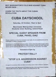 Scope and ContentPoster with the text: Why Washington's cold war against Cuba never ends ... Learn the truth about the Cuban revolution. Cuba dayschool, Saturday 22 October 10am to 5pm. Manchester Metropolitan University, Students Union building, Oxford Road. Special guest speaker from Cuba, Pavel Diaz. with details of programme and protest rally to follow the day school