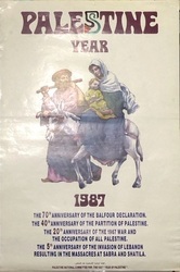 Scope and ContentPoster with an image of a man and a woman and child riding a donkey and the text: Palestine year. 11987. The 70th anniversary of the Balfour declaration. The 40th anniversary of the partition of Palestine. The 20th anniversary of the 1967 war and the occupation of all Palestine. The 5th anniversary of the invasion of Lebanon resulting in the massacres at Sabra and Shatila.