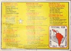 Scope and ContentPoster advertising a Latin American Festival for Peace and Freedom to be held on 3-10 Sep 1983 in London and organised by the Chile Solidarity Campaign with the Greater London Council.
