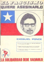Scope and ContentPoster with an image of of Exequiel Ponce and the text: El fascismo quiere asesinarlo. Exequiel Ponce. Porque es el jefe maximo del Partido Socialista en el interior de Chile. Porque es el mas alto dirigente de la Central Unica de Trabajadores preso por la dictadura. Porque es un lider de los trabajadores portuarios y maritimos chilenos