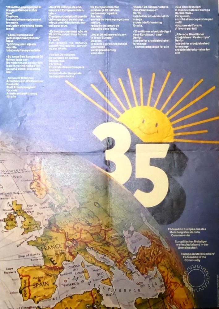 Scope and ContentPoster with an image of the sun rising above the figures 35 and a globe and the text: 20 million unemployed in Western Europe at this time. Therefore instead of unemployment for many, reduction of hours for all [in various European languages]