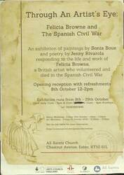 Scope and ContentPoster with an illustration of a woman and the text: Through An Artist's Eye: Felicia Browne and the Spanish Civil War. An exhibition of paintings by Sonia Boue and poetry by Jenny Rivarola responding to the life and work of Felicia Browne, a British artist who volunteered and died in the Spanish Civil War.