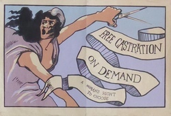 Scope and ContentPoster with an image of a woman holding a pair of scissors and the text: Free castration on demand. A woman's right to choose