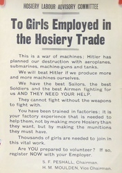 Scope and ContentPoster with the text: Hosiery Labour Advisory Committee. To girls employed in the hosiery trade. And encouraging women to volunteer to work in munitions factories