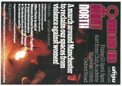 Scope and ContentPoster with an image of women at night and the text: Reclaim the Night North. A march around Manchester to reclaim our spaces from violence against women! Friday 23 April: 8pm start from Club Academy Students' Union, Oxford Road. Other bits ... all in Club Academy! 6.30pm: Free food. Stalls from local groups and placard making for the march. After Party in aid of Women Asylum Seekers Together. Inspirational speakers; performance poetry from Vanessa Fay; The Spokes bicycle dance troupe; Live music and DJs. All genders welcome!