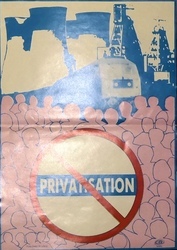 Scope and ContentPoster with an image of a power station, a mine and a train with a No Entry red circle and outlines of a group of people and the text: Privatisation Published by Unite. KARU.