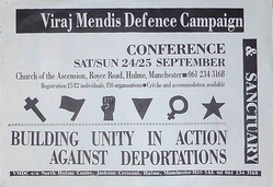 Scope and ContentPoster with various imeages and the text: Viraj Mendis Defence Campaign and sanctuary. Conference Sat/Sun 24/25 September. Church of the Ascension, Royce Road, Hulme, Manchester. Building unity in action against deportation