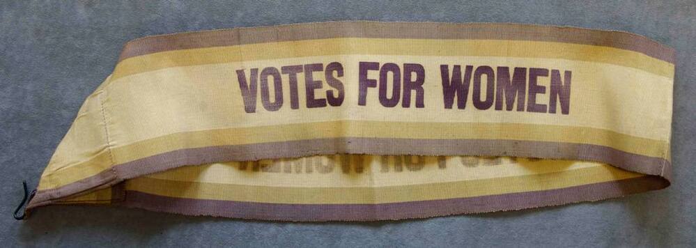 Scope and ContentPurple, cream and beige sash, with Votes for Women in purple on a cream background with beige and purple border round the edge of the sash (Restricted access - contact WCML for details)