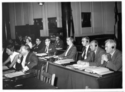 Scope and ContentBlack and white photograph of Clerical and Administrative Workers Union delegates to the triennial Congress of the International Federation of Commercial, Clerical and Technical Employees. The delegates are seated and wearing headphones Caption on the back: Reading from L-R - Helene Walker (MBE, JP, President), John Likier, Bernard Bagnari (was London County Councillor and BBC Italian broadcaster), Anne Godwin (General Secretary), Tudor Thomas (Assistant General Secretary), Frank Leath (Executive Council Midlands), Dai Brown (Executive Council Wales). Two German delegates front Ingebay Hellyiard, Werner Liemann