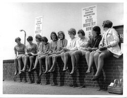 Scope and ContentBlack and white photograph of women members of the Clerical and Administrative Workers Union sitting on a wall, two holding placards