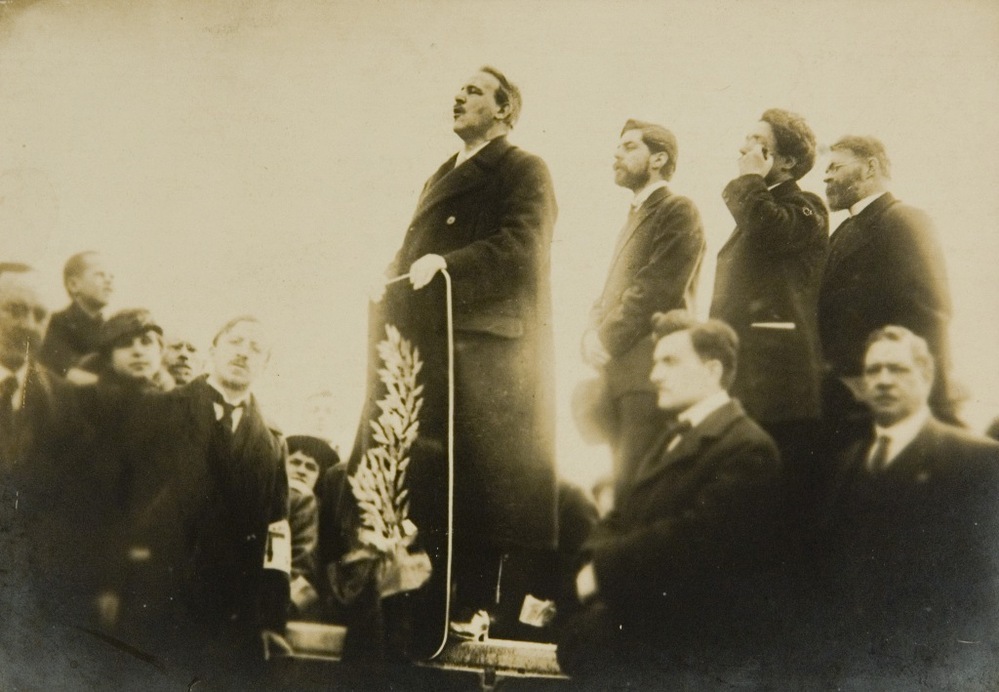 Scope and ContentBlack and white photograph of delegation standing on a platform surrounded by people. Caption: Demonstration at Petrograd to the memory of the martyrs who fell in the fighting for the revolution. Lieut. Sanders giving an address