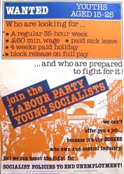 Scope and ContentPoster with the text: Wanted youths age 15 to 25 who are looking for ... A regular 35 hour week. £60 min. wage. Paid sick leave. 4 weeks paid holiday. Block release on full pay ... and who are prepared to fight for it! Join the Labour Party Young Socialists. we can't offer you a job ... because it's the bosses who own and control industry. but we can boost the fight for socialist policies to end unemployment