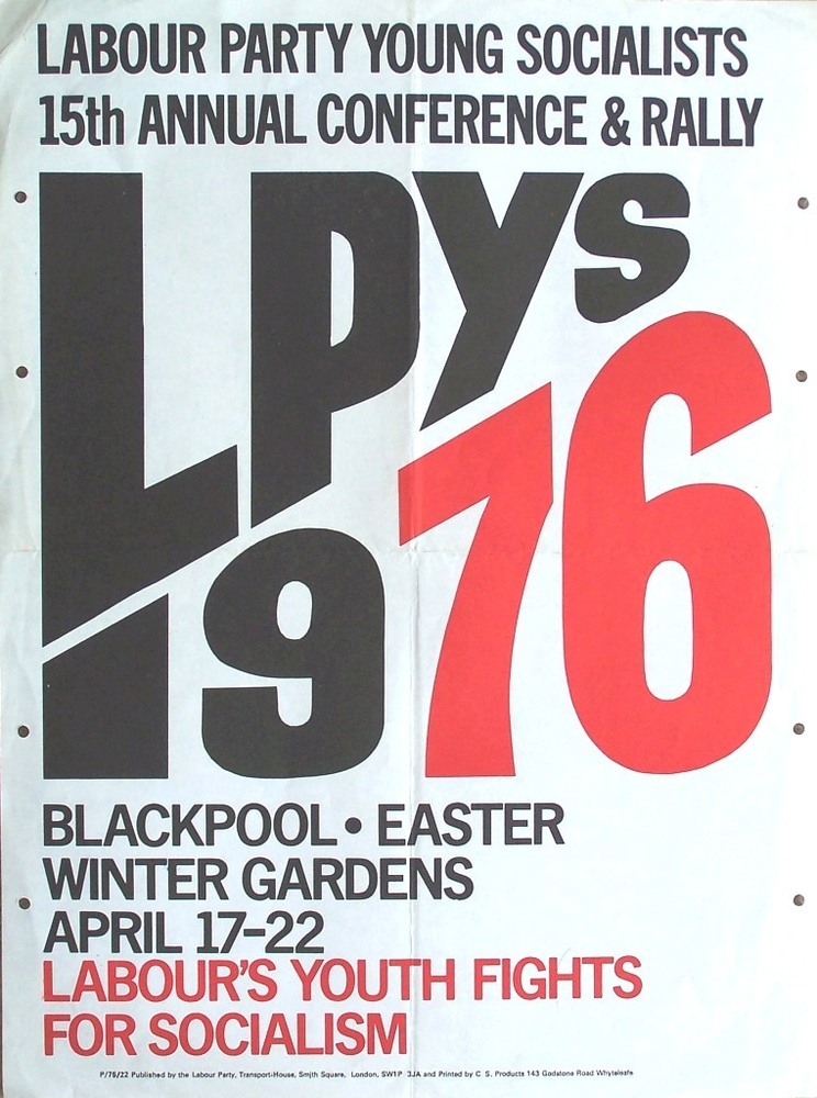 Scope and ContentPoster with the text: Labour Party Young Socialists 15th annual conference and rally. LPYS 1976. Blackpool, Easter, Winter Gardens April 17-22. Labour's youth fights for socialism