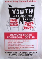 Scope and ContentPoster with the text: Labour Party Young Socialists Youth against the Tories. End cheap labour. Jobs for youth. Demonstrate Liverpool Oct 16. (with details of the demonstration). Build the Labour Party Young Socialists