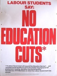 Scope and ContentPoster with the text: Labour students say: no education cuts. "A Labour government will expand the Education Service" ... and "increase social equality by giving far greater importance to full employment, housing, education and social benefits" The February 1974 on which the Labour government was elected