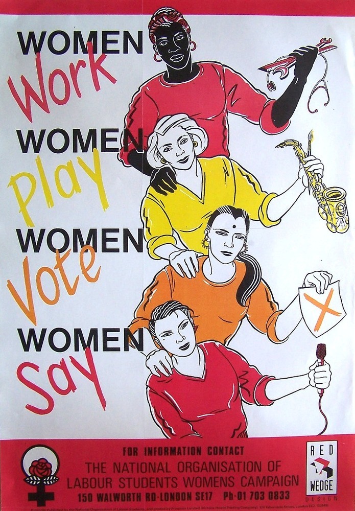 Scope and ContentPost with images of a woman holding tools, a woman holding a saxaphone, a woman with a ballot paper and a woman holding a microphone and the text: Women work, women play, women vote, women say. Labour Party Students Women's Campaign