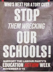 Scope and ContentPoster with the text: Who's next for a Tory cut? Stop them wrecking our schools! Support the Labour Party's education action week November 18-24. Published by the Labour Party.