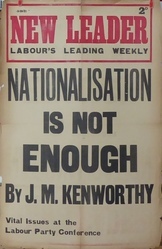 Scope and ContentPoster with the text: New Leader. Labour's leading weekly. Nationalisation is not enough by JM Kenworthy. Vital issues at the Labour Party conference