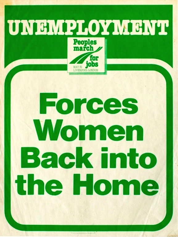 Scope and ContentPoster with the text: Unemployment forces women back into the home. Peoples March for Jobs, May 81, Liverpool London