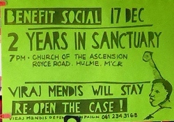 Scope and ContentPoster with an image of a person with a clenched fist and the text: Benefit social 17 Dec. 2 years in Sanctuary. 7pm, Church of the Ascension, Royce Road, Hulme, Mcr. Viraj Mendis will stay. Re-open the case!