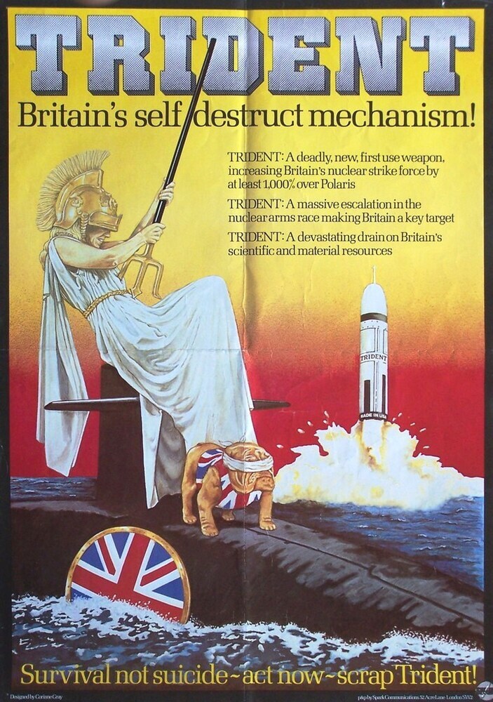 Scope and ContentPoster with an image of Britannia sitting on a submarine and stabbing herself with a trident with blindfolded Bulldog at her feet and the text: Trident. Britain's self-destruct mechanism! Trident: A deadly, new, first use weapon increasing Britain's nuclear strike force by at least 1,000% over Polaris. Trident: A massive escalation in the nuclear arms race making Britain a key target. Trident: A devastating drain on Britain's scientific and material resources. Survival not suicide. Act now. Scrap Trident
