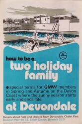 Scope and ContentPoster with an image of the holiday centre and the text: How to be a two holiday family. Special terms for GMW members in Spring and Autumn on the Devon coast where the sunny season starts early and ends late at Devondale