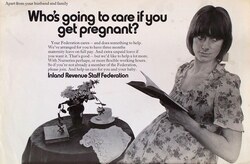 Scope and ContentPoster with a photograh of a pregnant woman reading a book and the text: Apart form your husband and family who's going to care if you get pregnant? Your Federation cares - and does something to help. We've arranged for you to have three months maternity leave on full pay. And extra unpaid leave if you want it. That's good - but we'd like to help a lot more. With nurseries perhaps, or more flexible working hours. So if you are not already a member of the Federation, please join. And help us care for you and your baby