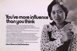 Scope and ContentPoster with a photograph of Peggy Ng and the text: You've more influence than you think. Mainly because you've more friends than you know. For example, did you know about Peggy? Miss Peggy Ng of Singapore won the Federation Scholarship this year and came over to study our aims and methods. She toured our offices, met our members, learnt how we work and how we try to help people. Back in Singapore she'll use a lot of the methods she learnt from us. (And back here, we'll benefit from some of her experience - like her information on the study of nurseries for working mothers and on women's role in the public sectors.) It's this kind of two-way influence that can do so much good. Not just in Britain and Singapore, but in every country that sends entrants for the Scholarship. And you support that every time you support your Federation