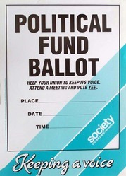 Scope and ContentPoster with the text: Political fund ballot. Help your union to keep its voice. Attend a meeting and vote yes. With space for meeting details