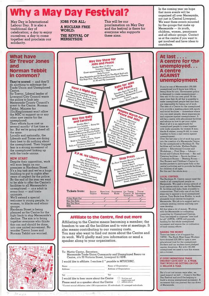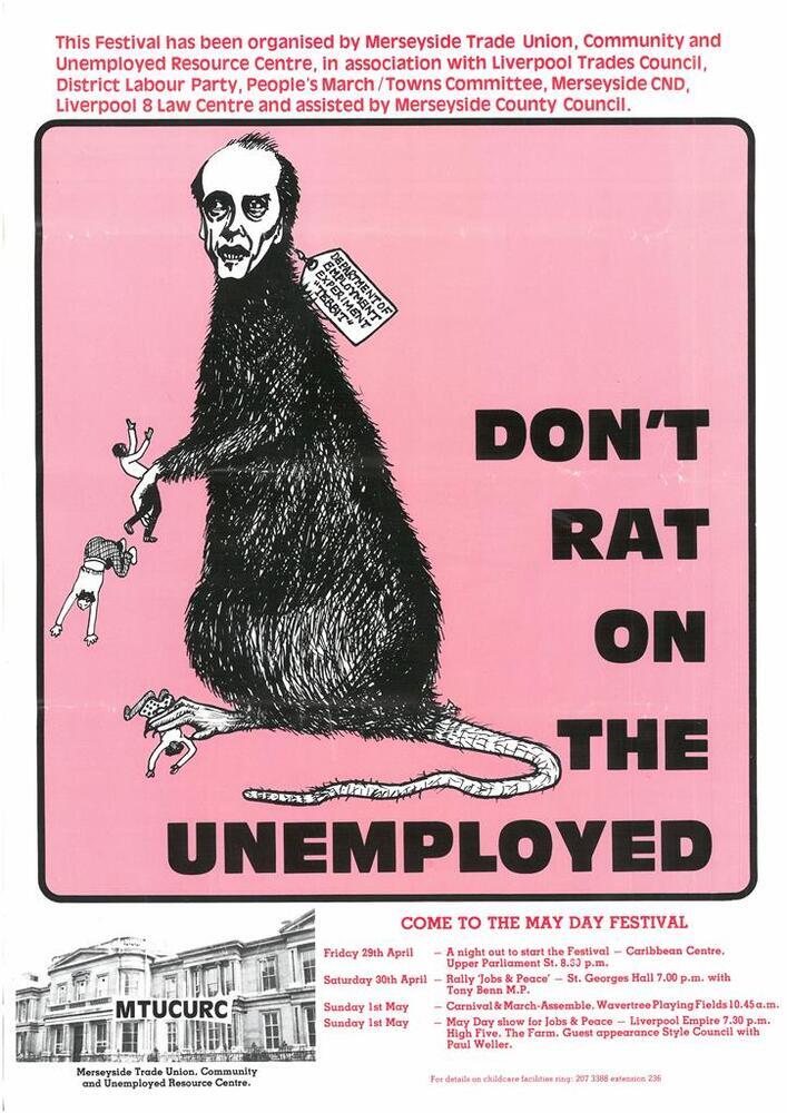 Scope and ContentPoster with an image of a rat with the head of Norman Tebbit and the text: This festival has been organised by Merseyside Trade Union Community and Unemployed Resource Centre, in association with Liverpool Trades Council, District Labour Party, People's March/Towns Committee, Merseyside CND, Liverpool 8 Law Centre and assisted by Merseyside County Council. Don't rat on the unemployed. Come to the May Day festival. with details of programme of events. On reverse: information about Norman Tebbit and about the Merseyside Trade Union Community and Unemployed Resource Centre