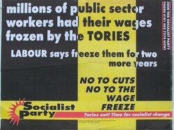 Scope and ContentPoster with the text: Millions of public sector workers had their wages frozen by the Tories. Labour says freeze them for two more years. No to cuts. No to the wage freeze. Tories out! Time for socialist change