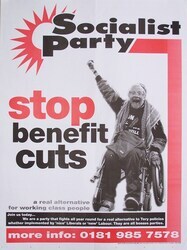 Scope and ContentPoster with an image of a man in a wheelchair and the text: Socialist Party. Stop benefit cuts. A real alternative for working class people. Join us today ... We are a party that fights all year round for a real alternative to Tory policies whether implemented by 'nice' Liberals or 'new' Labour. They are all bosses parties