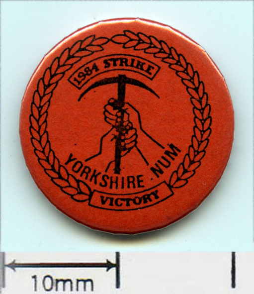 Scope and ContentRed and black. Laurel wreath around Illustration of 2 hands holding a pick axe. Lettering - 1984 Strike. Yorkshire NUM. Victory.